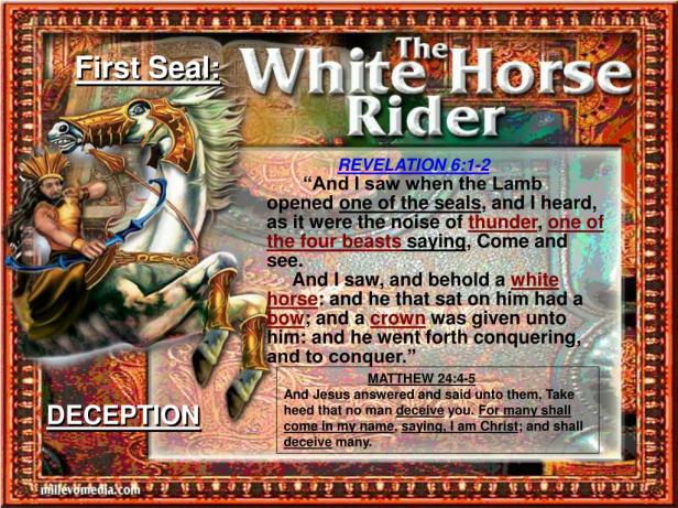 Revelation 6:1-2 And I saw when the Lamb opened one of the seals, and I heard, as it were the noise of thunder, one of the four beasts saying, Come and see. And I saw, and behold a white horse: and he that sat on him had a bow; and a crown was given unto him: and he went forth conquering, and to conquer.